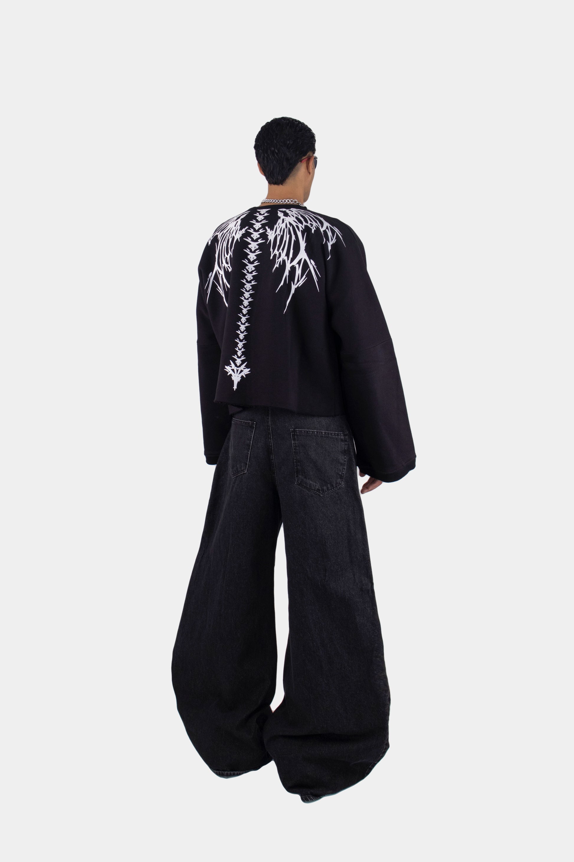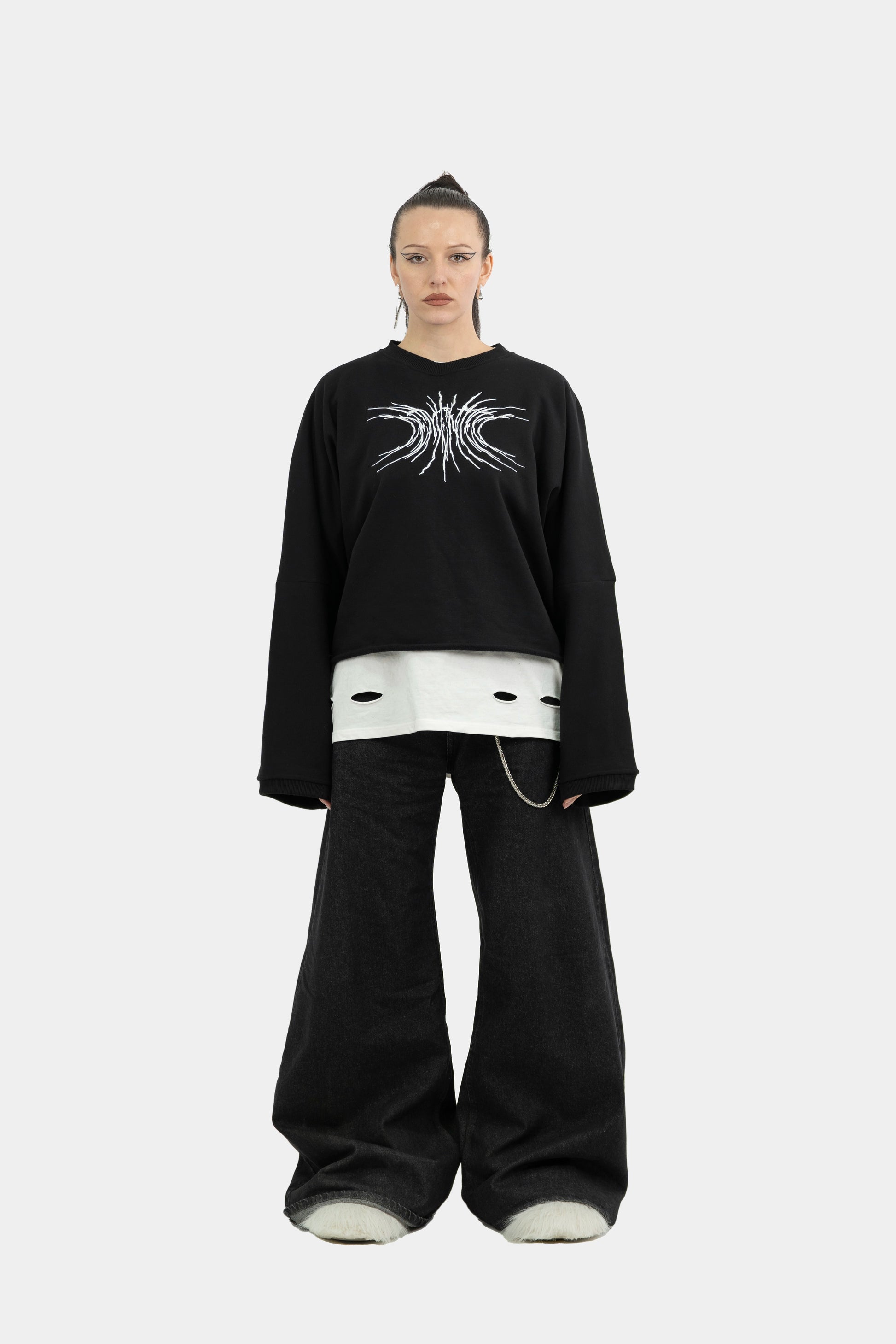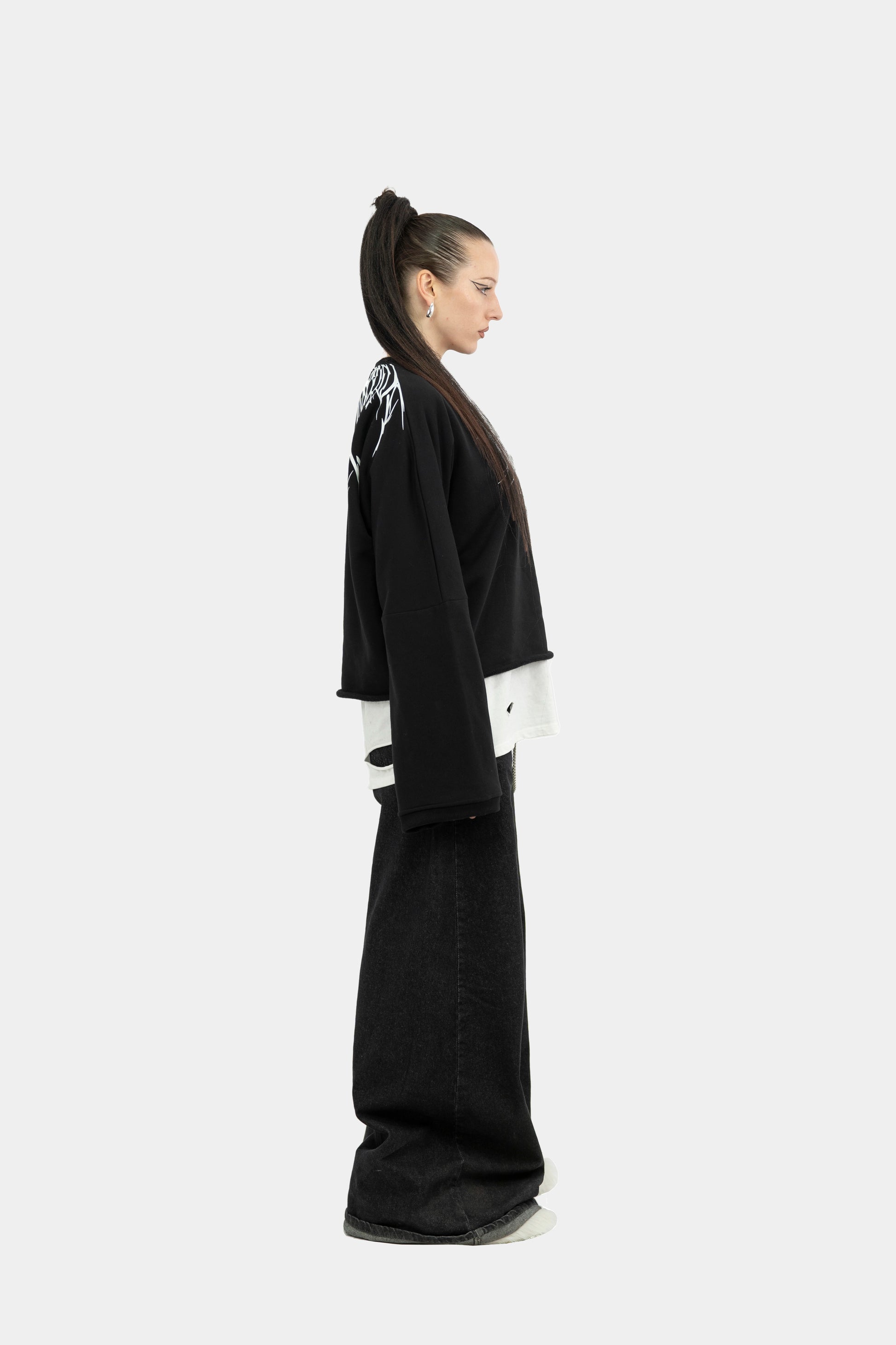The exaggerated sleeve shape contrasts the short cut — balancing minimalism with distortion.