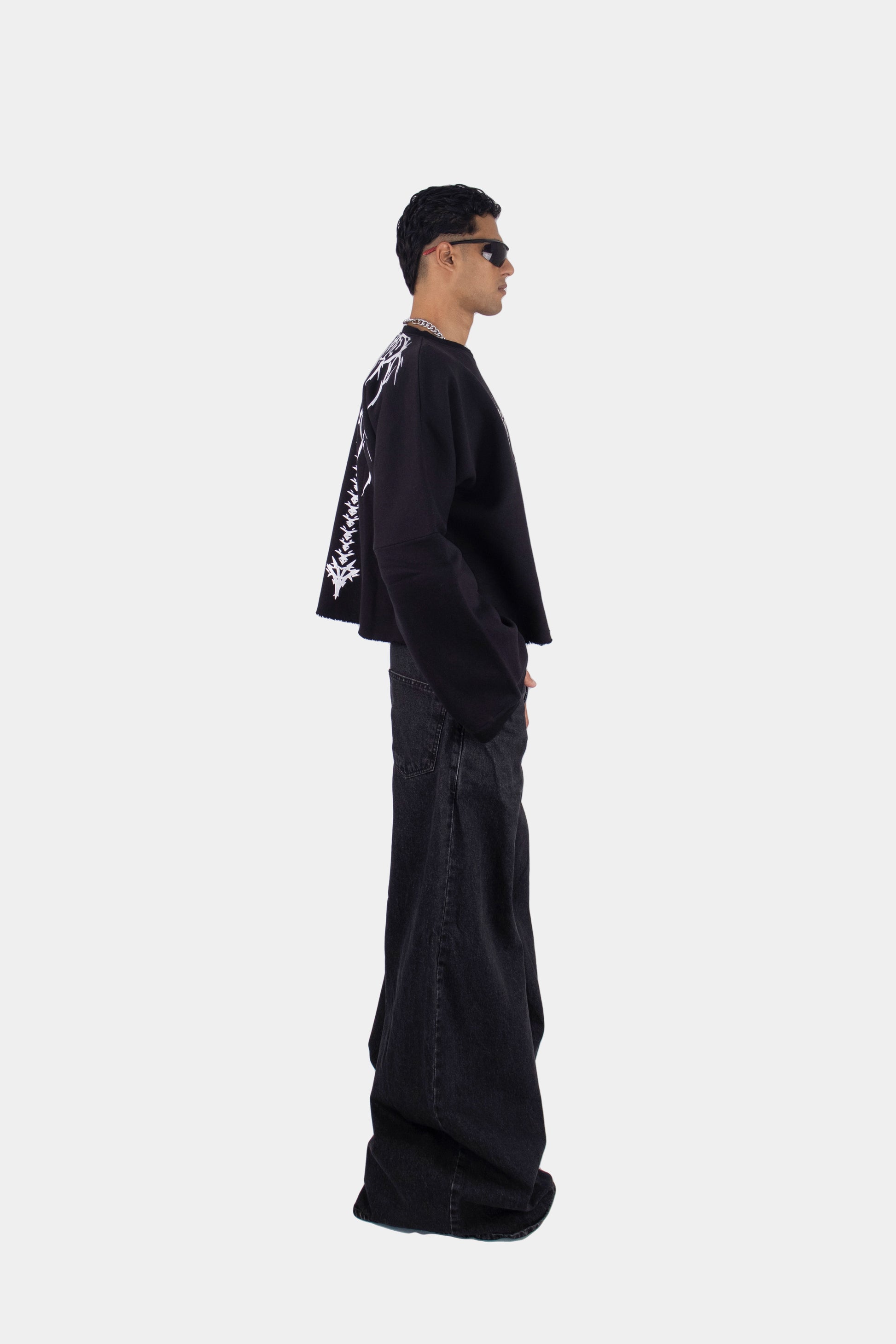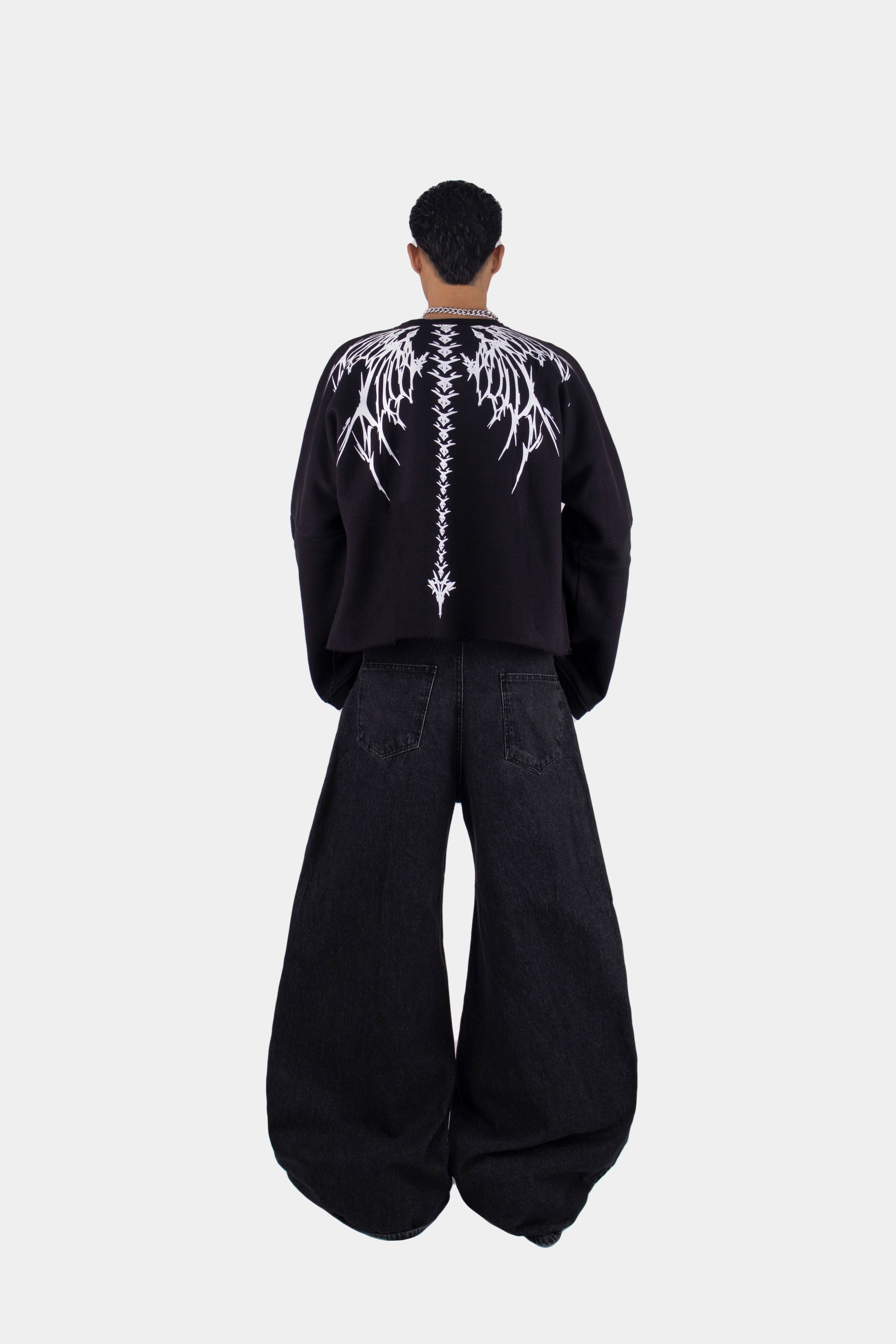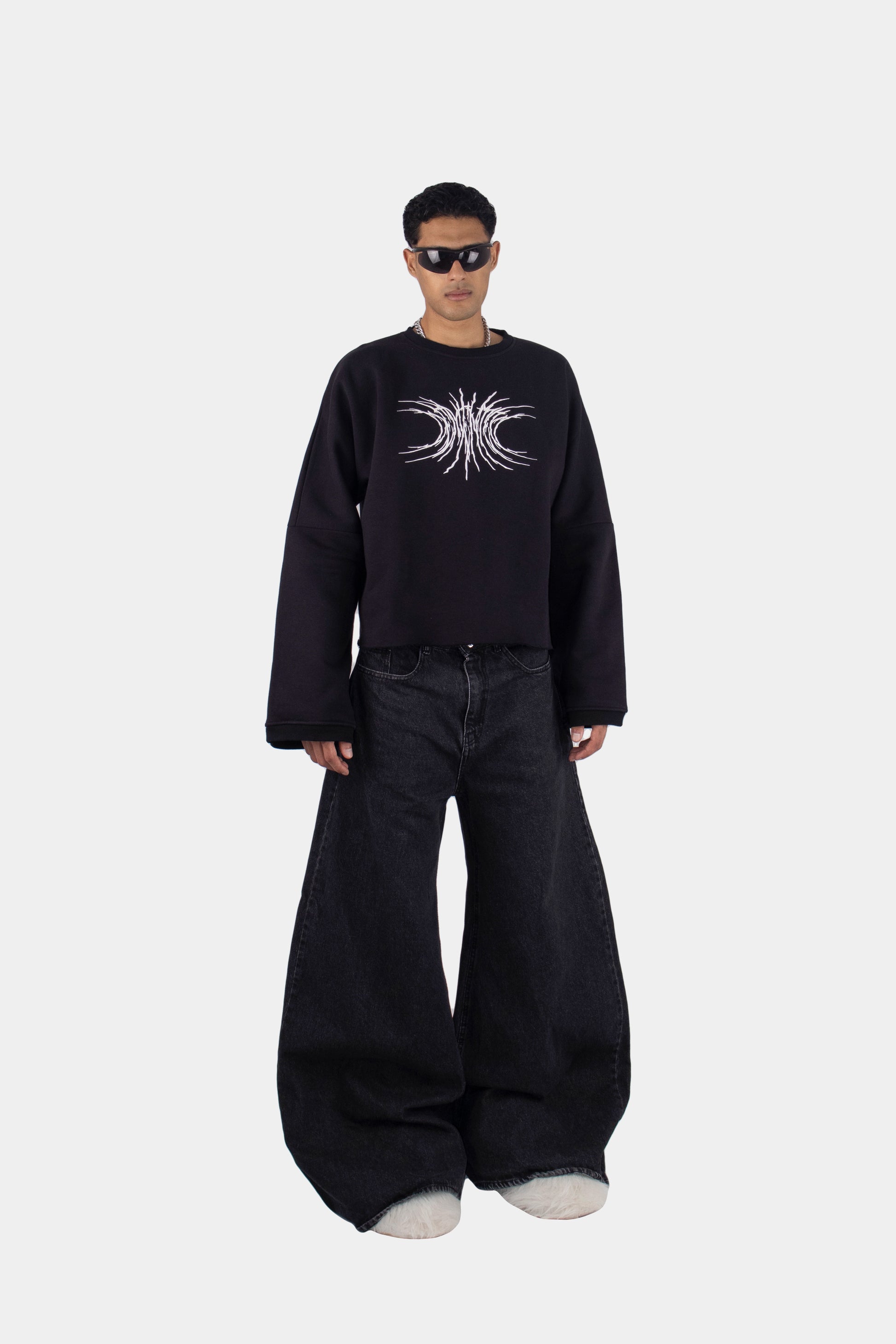 The exaggerated sleeve shape contrasts the short cut — balancing minimalism with distortion.