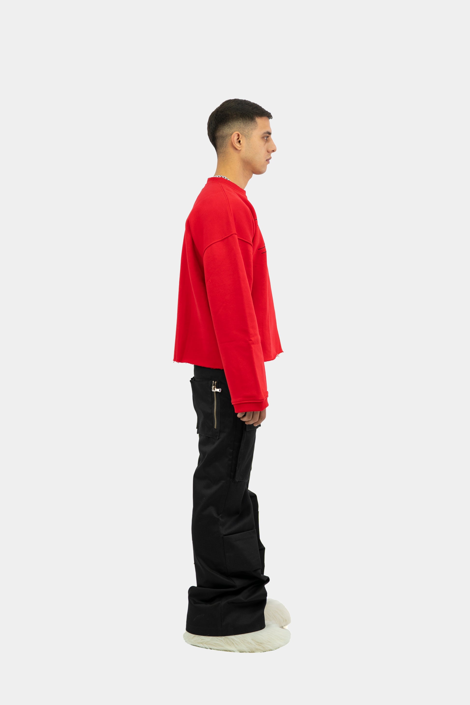 The cropped cut and oversized sleeves remain, but the back print is stripped away.