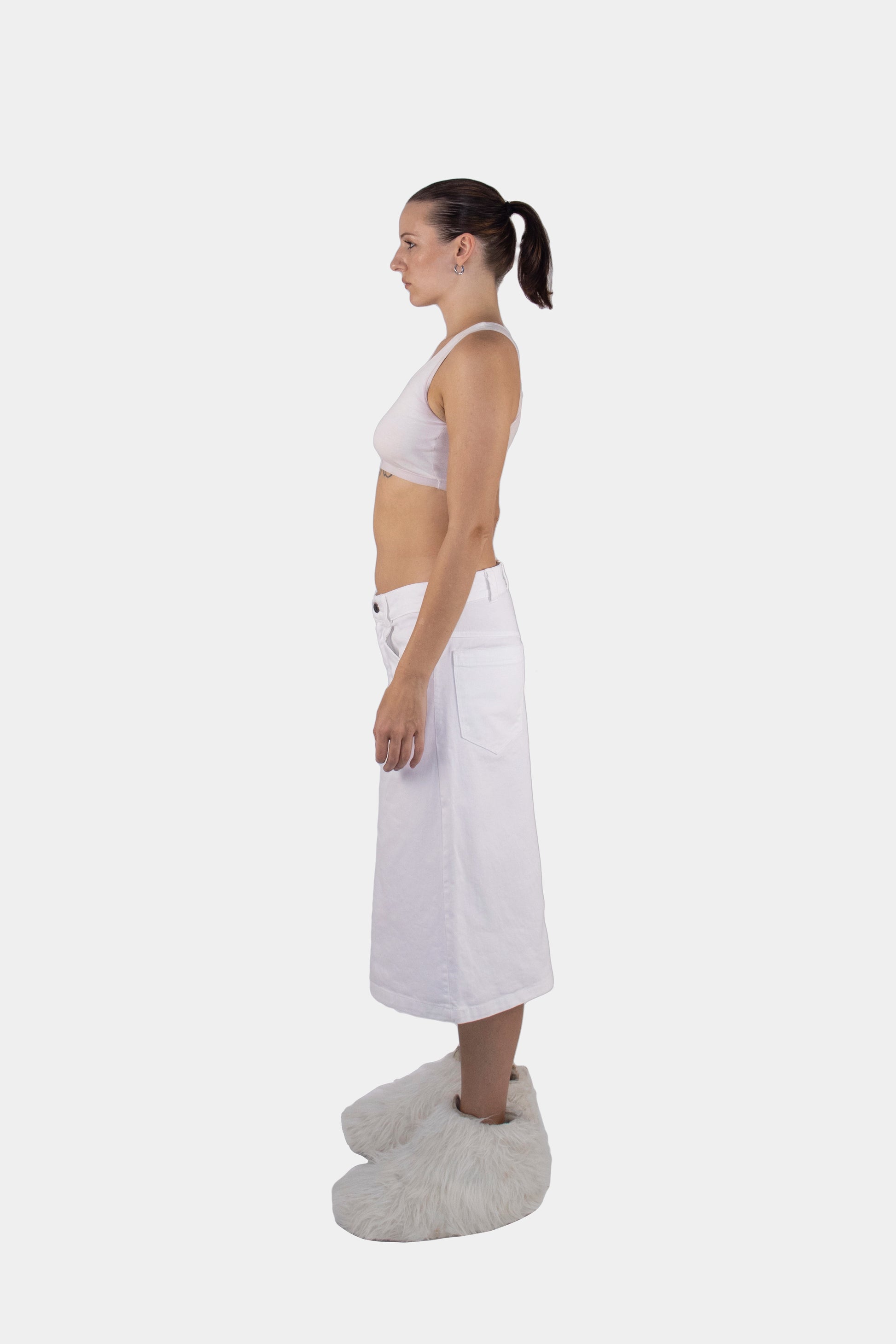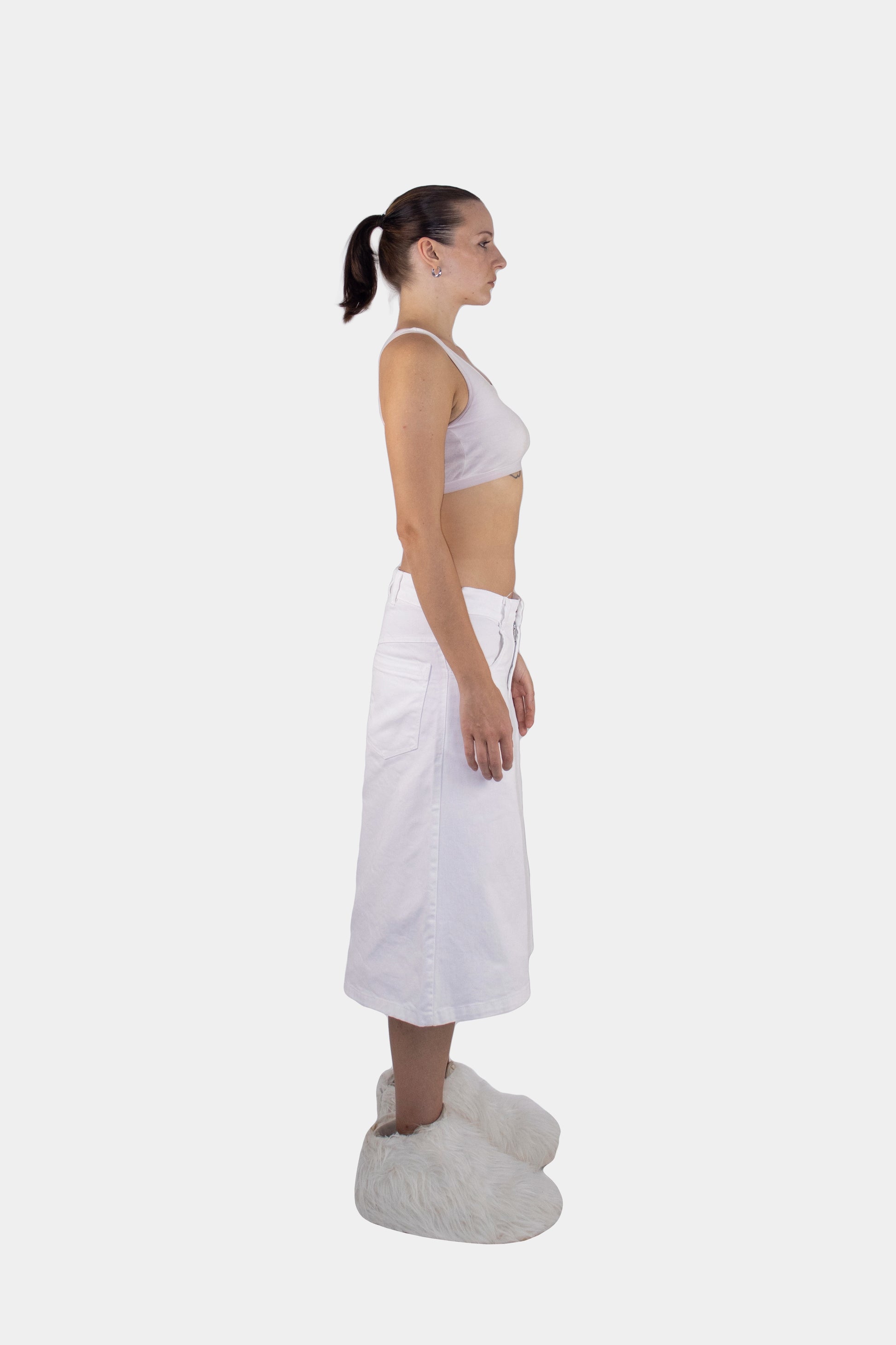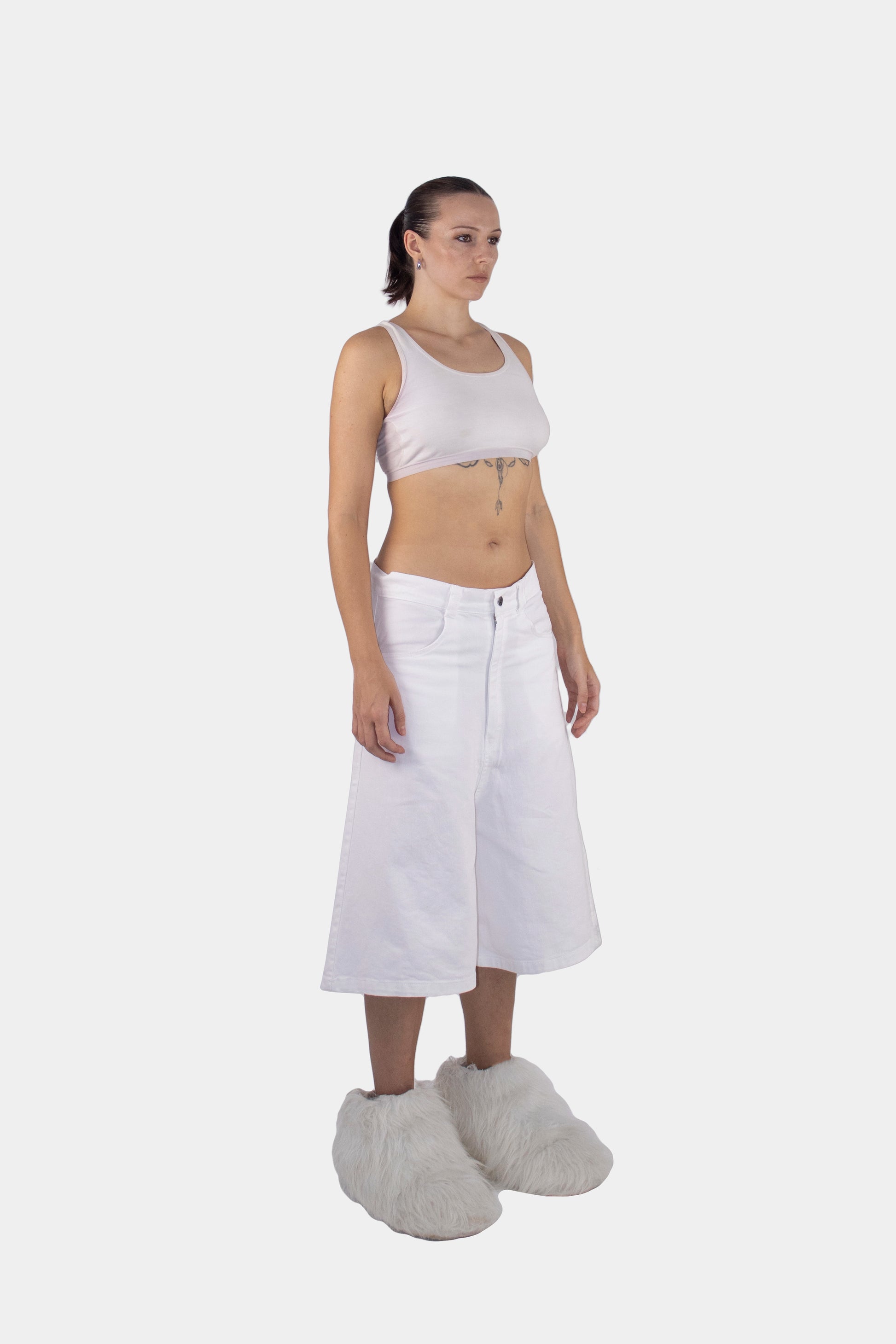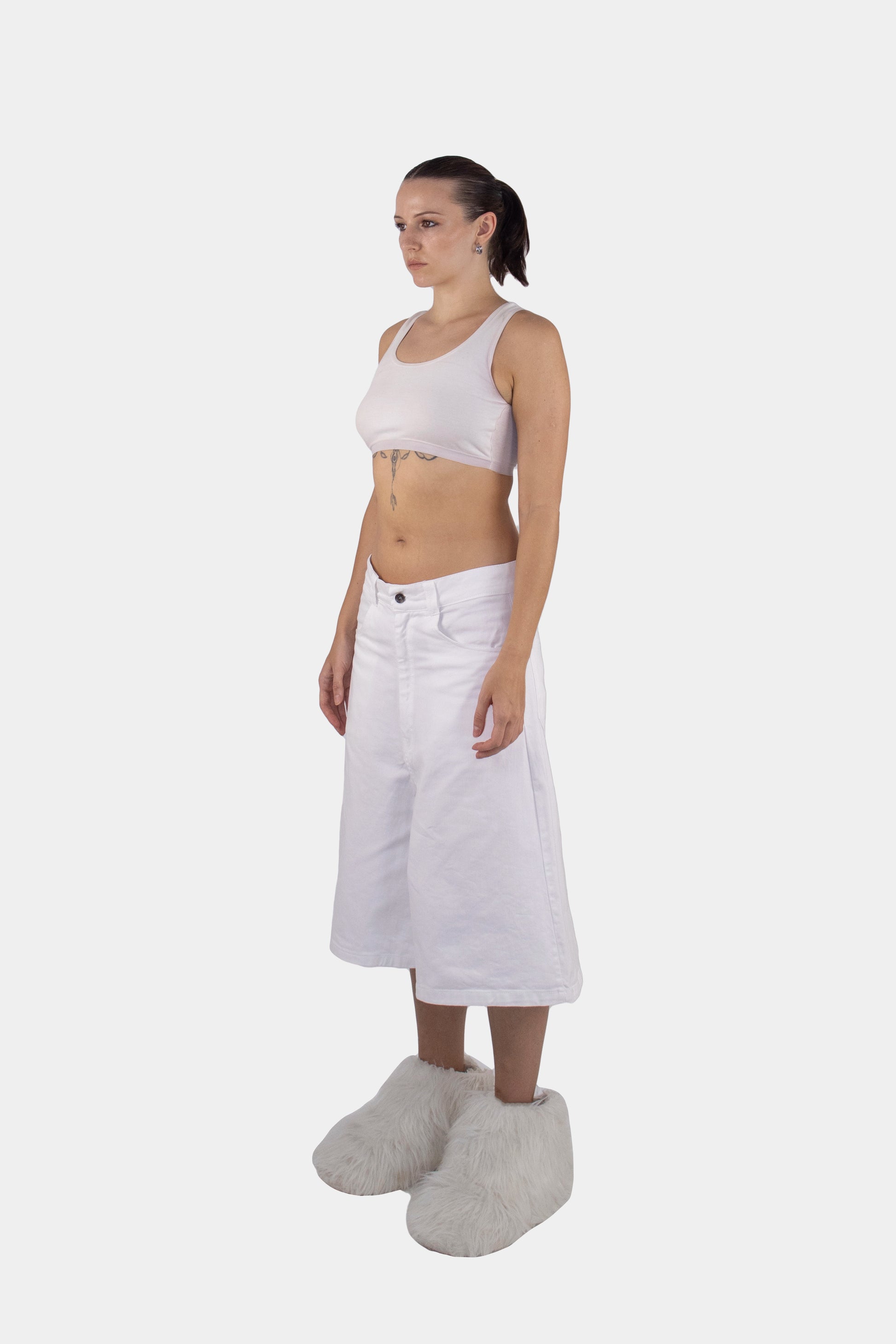 The cut introduces sharp geometry, shifting how the body is perceived.